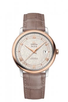 La collection OMEGA De Ville Prestige à attire un public large et fidele avec son design classique et elegant. Ces garde-temps se caracterisent par un style pur avec des finitions de luxe intemporelles. Ce modele est dote d'un cadran argente en ivoire avec un motif en soie et une finition opaline. Les mains sont plaquees ou plaquees et les marqueurs d'heures comprennent six cabochons plaques ainsi que des chiffres romains plaques. Il y à une fenêtre de date à 3 heures. Le boitier de 39,5 mm est Inoxydable Acier et 18K Or rouge et est presente sur un bracelet en cuir taupe-brun. Au c?ur de ce garde-temps se trouve le Co-Axial Calibre 2500.