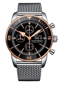 Concue dans le but d'accompagner les plongeurs professionnels et militaires dans leurs missions en eaux profondes, cette montre Chronographe Breitling Superocean Heritage II à été equipee d'une lunette à cliquet unidirectionnelle en or rose et ceramique noire de 44mm et d'un boitier en acier inoxydable egaliser la pression à l'interieur et à l'exterieur du boitier en aidant à sa resistance à l'eau de 200 mêtres.