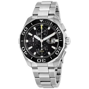 Boîtier en acier inoxydable avec un bracelet en acier inoxydable. Lunette tournante unidirectionnelle en acier inoxydable avec un anneau superieur en ceramique noire. Cadran noir avec aiguilles et index indexes argentes. Minute marqueurs autour de la jante exterieure. Type de cadran: analogique. Aiguilles et marqueurs luminescents. Affichage de la date à la position 3 heures. Chronographe - trois sous-cadrans affichant: 60 secondes, 30 minutes et 12 heures. Mouvement automatique avec une reserve de marché de 42 heures. Glace saphir anti-rayures. Couronne vissee. Solide affaire en arrière. Diamètre du Boîtier: 43 mm. epaisseur du Boîtier: 15 mm. Boîtier rond Largeur de bande: 21 mm. Fermoir de deploiement. Resistant à l eau à 300 mêtres/1000 pieds. Fonctions: chronographe, date, heure, minute, seconde. Style de montre de sport. Regarder l etiquette: Swiss Made. Variations d article: CAY211A BA0927, CAY211A-BA0927, CAY211A/BA0927, CAY211ABA0927. Tag Heuer Aquaracer cadran noir chronographe automatique montre pour hommes CAY211A.BA0927.